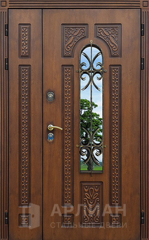 Металлическая двустворчатая дверь со стеклом и кованой решеткой №15